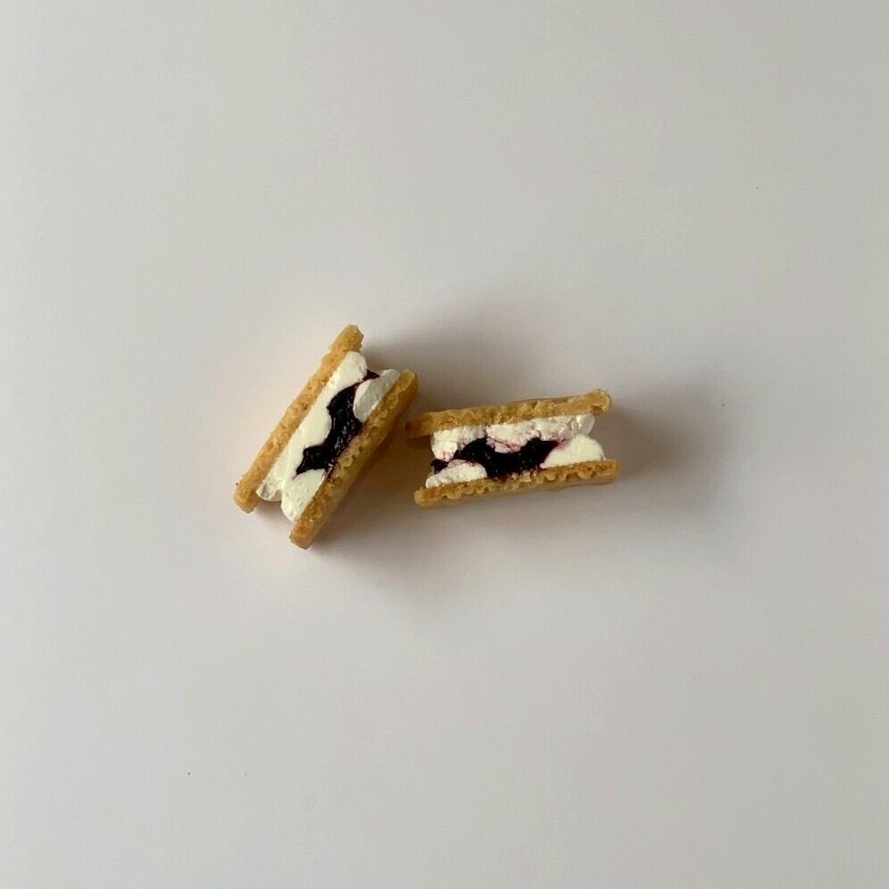 クッキー生地の間に、ブルーベリー特有の甘酸っぱいソースとバタークリームがたっぷりと挟まれており、食べるたびに口の中で広がる風味が魅力です。